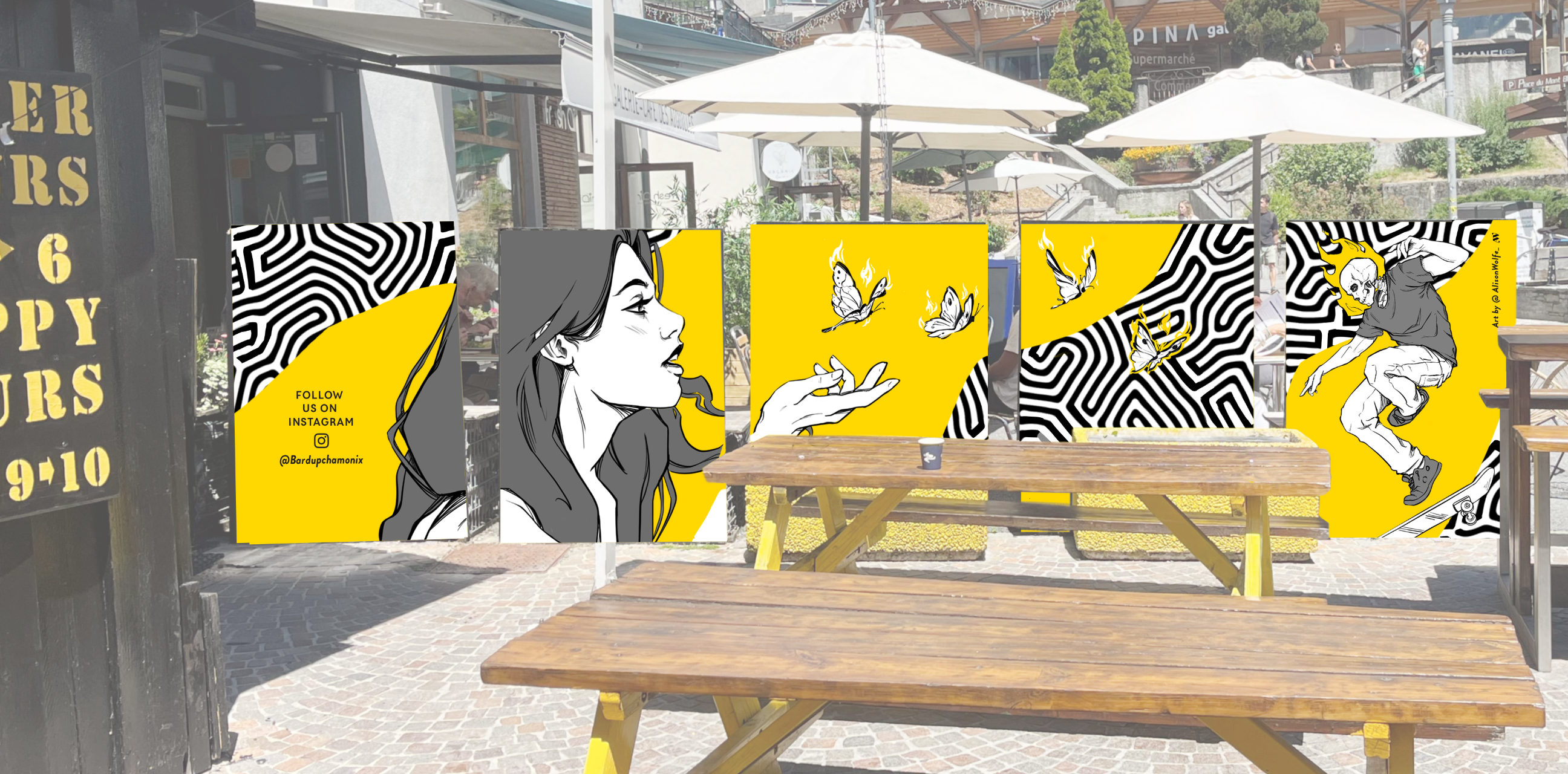 Mural artwork on 5 wood panels commissioned by Bar'Dup, bar in Chamonix-Mont-Blanc, France, for their outside seating area. The colours and skater theme match the bar's existing identity and decoration.